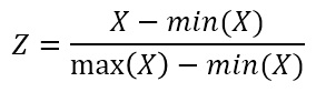정규화는 가장 작은 값을 0으로, 가장 큰 값을 1로 처리하여 해당 컬럼의 범위를 0과 1사이로 변환하는 방법입니다. 정규화란 표현보다는 주로 민맥스 스케일링(Min-Max scaling)이라 표현하며, 일반적으로 해당 컬럼이 정규분포가 아니거나 음수를 취하면 안될 경우에 사용합니다. 수식으로는 다음과 같습니다.