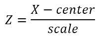 Z는 스케일링 후의 컬럼, X는 스케일링 전의 컬럼(원 자료)을 의미하며 center, scale 변수에 대한 값은 스케일링의 방법에 따라 다른데, 이는 아래 파트에서 설명하겠습니다.