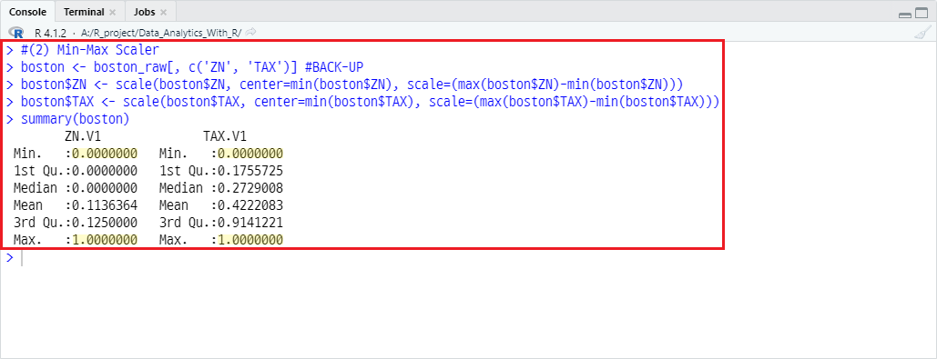 scale() 함수에서 center 파라미터에 min() 함수를, scale 파라미터에 (max()-min()) 함수를 대입하여 민맥스 스케일링으로 처리할 수 있는데, 예시는 다음과 같습니다.