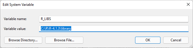 (4) Variable name은대문자를구분하여"R_LIBS"으로, value는 원하는 경로로 지정합니다.