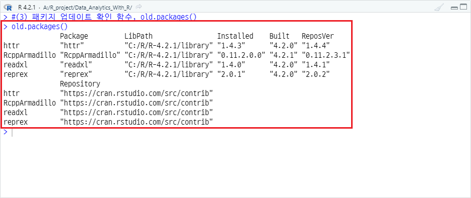 (4) 패키지 업데이트 여부 확인 함수, old.packages()