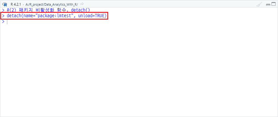 활성화한 패키지를 비활성화하고자 할 경우, detach() 함수를 사용할 수 있습니다. 다만 detach() 함수는 다양한 용도로 사용되므로 패키지 비활성화를 하고자 할 경우, package:패키지명으로 인자를 투입해야합니다.