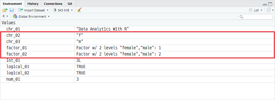 환경창에서 결과를 확인하면 factor_01 객체는 f라는 값에서 female로 레이블 변환되었고, factor_02 객체는 m이라는 값에서 male로 레이블 변환됐음을 확인할 수 있습니다. 허나 실제로 컴퓨터가 인식하는 값은 f는 1, m은 2임에 유의해야 합니다.